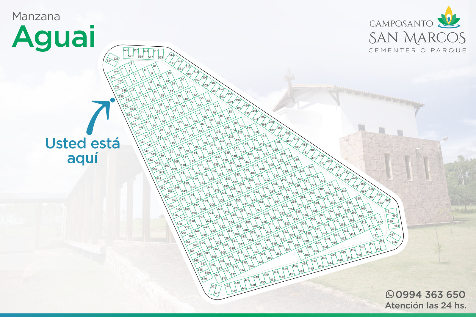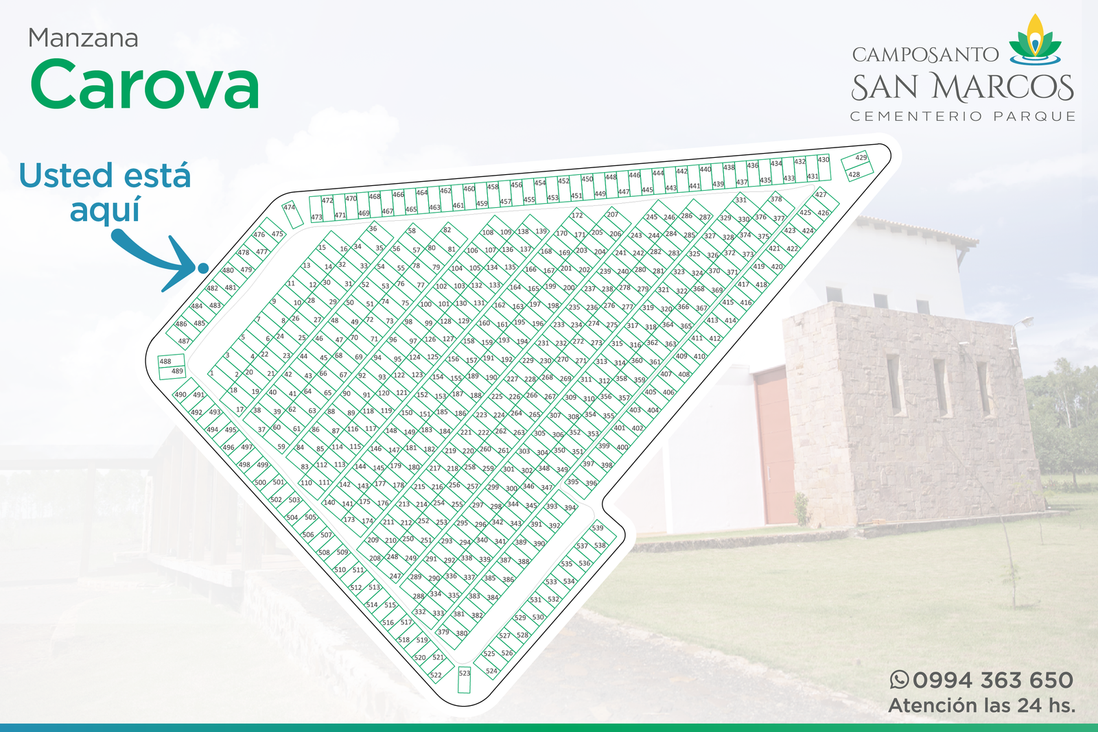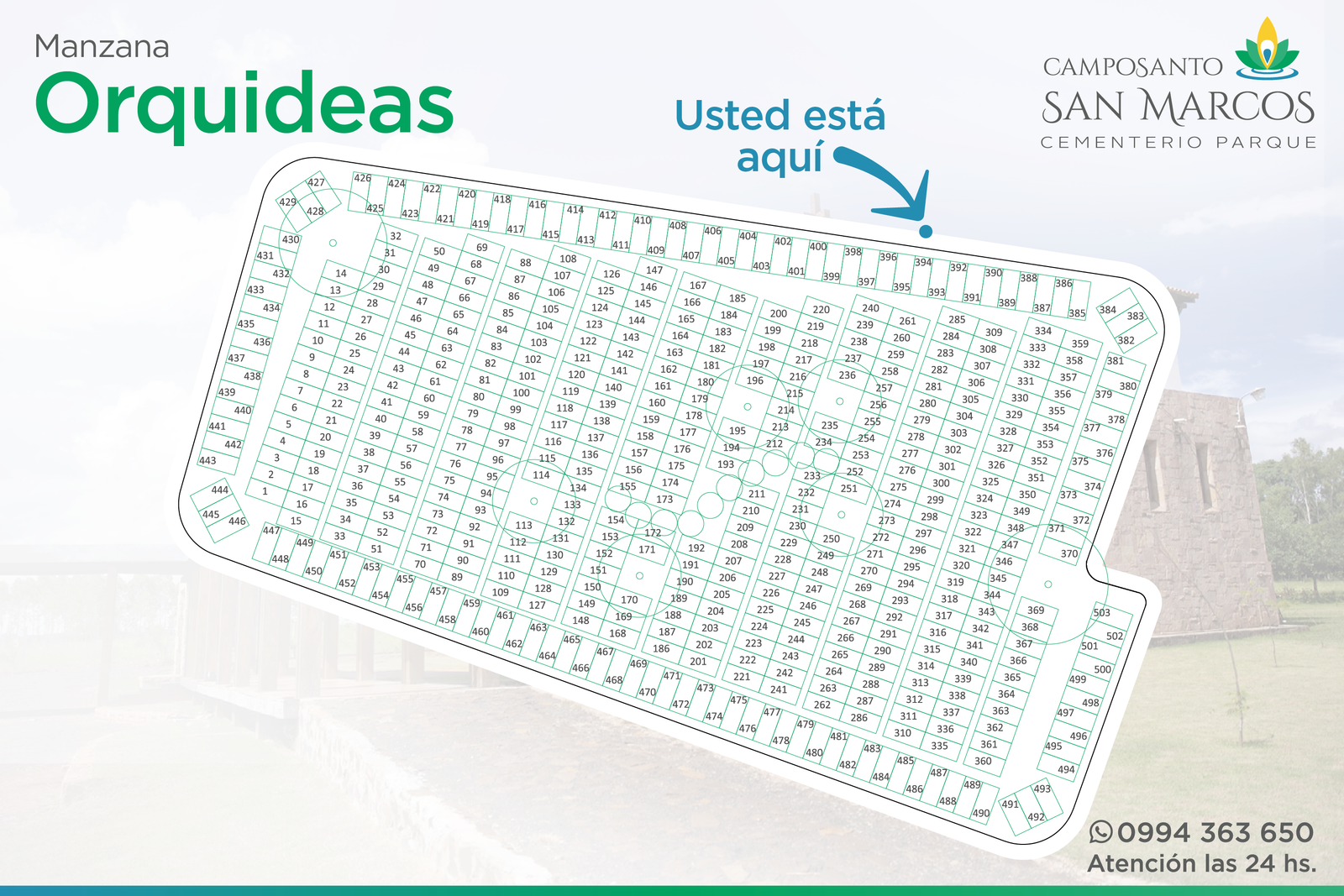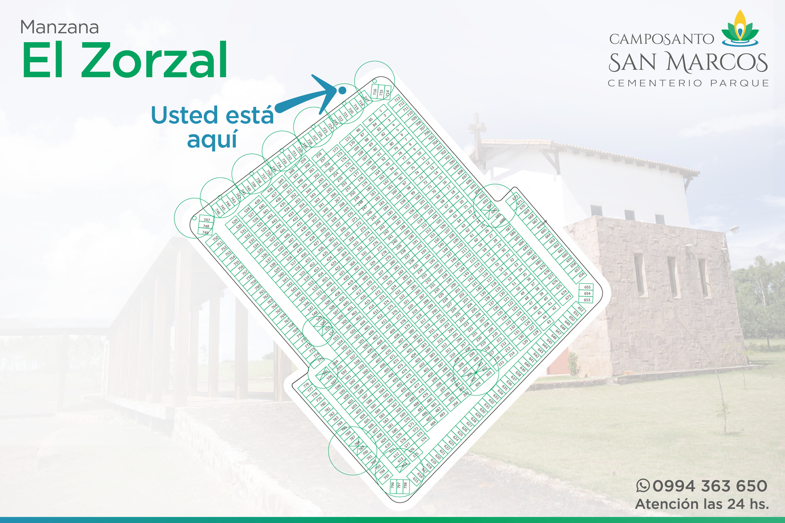 Camposanto San Marcos es un cementerio parque de primer mundo, desarrollado sobre la base de un cuidadoso y sostenido mantenimiento de su especial parquización, sus decoraciones arbustivas y florales; característica principal que brinda calidéz al parque y sus instalaciones, para recibir cotidianamente la visita de parientes y amigos de quienes allí descansan.