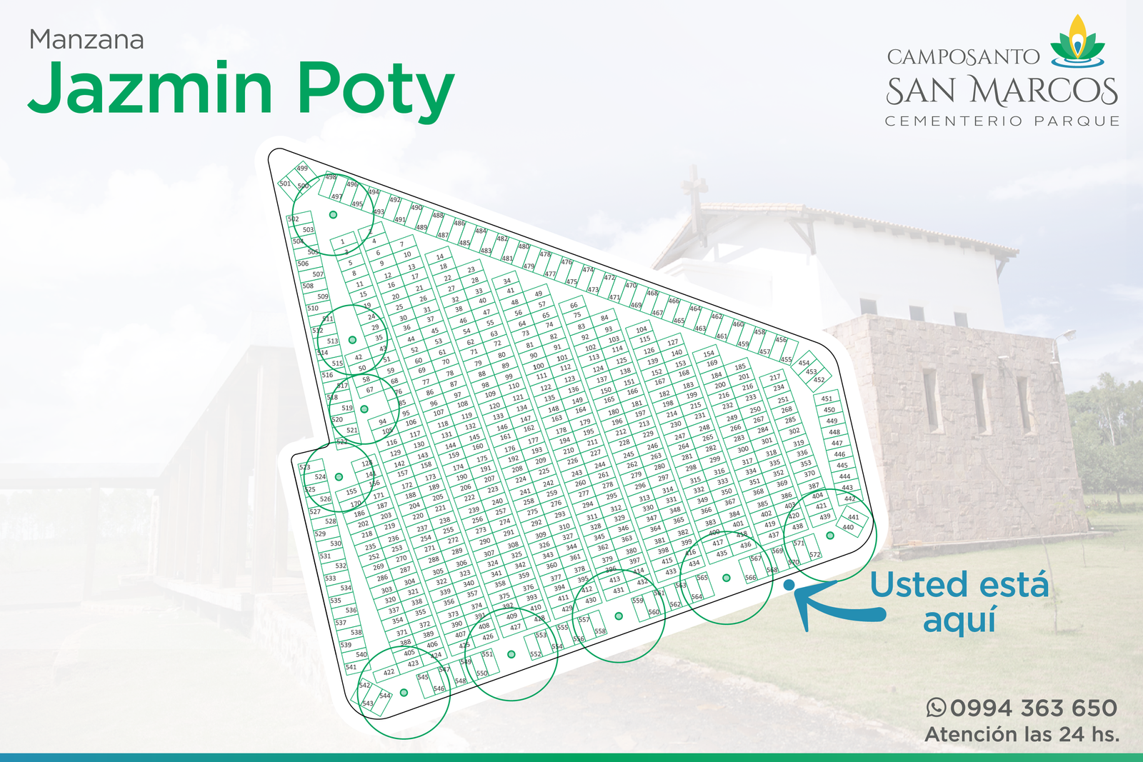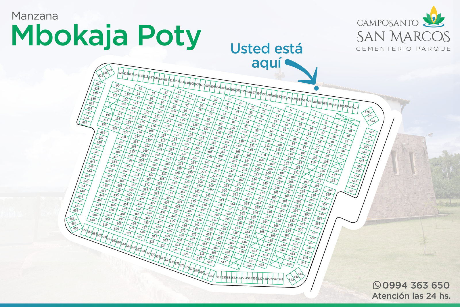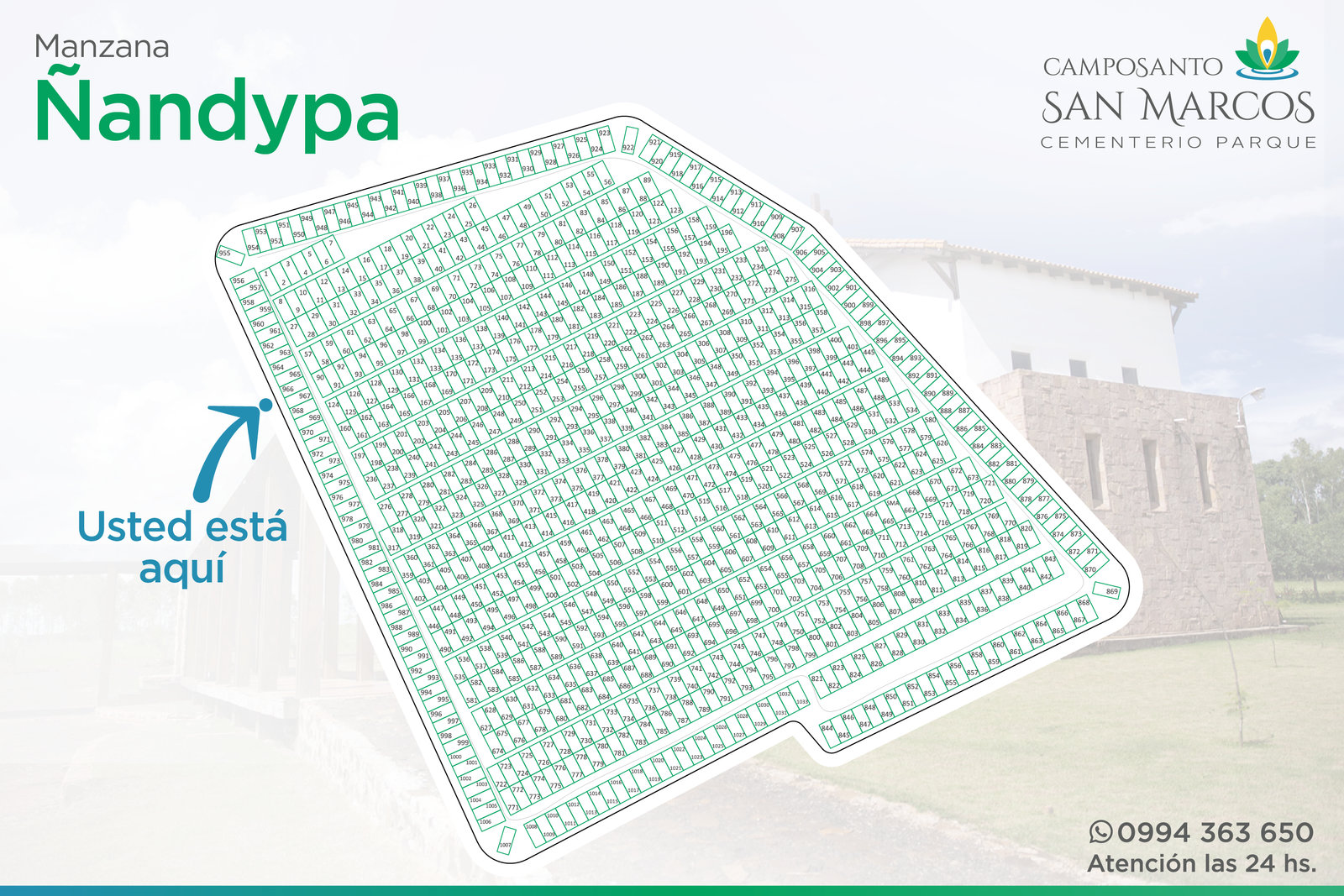 Camposanto San Marcos posee acuerdos especiales con todas las funerarias de la región: Presidente Franco, Ciudad del Este, Minga Guazú, Hernandarias, Santa Rita y alrededores (Ver listado de funerarias). Basta que el cliente tome contacto con nuestra administración, para que nuestro personal experimentado se ocupe de coordinar lo necesario, de acuerdo a los requerimientos del cliente. Incluso, si el cliente así lo solicitara, nuestro personal se ocupará de gestionar la documentación relacionada con los servicios de inhumación.